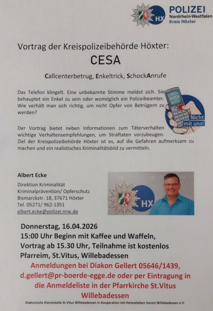 Die diakonische Dienststelle St. Vitus und Heimatleben Willebadessen laden ein zu einem interessanten Vortrag der Polizei.