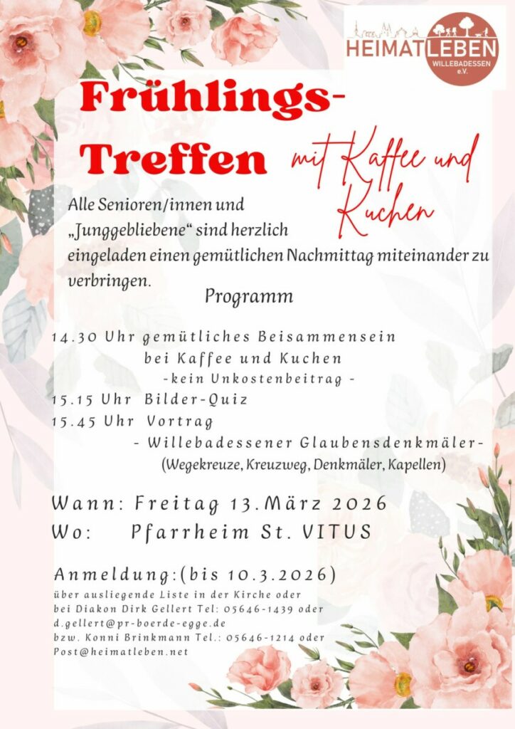 Der Heimatverein „Heimatleben Willebadessen“ lädt zum alle Senioren/innen und „Junggebliebene“ herzlich ein zum FRÜHLINGS-TREFF mit Kaffee und Kuchen ein. – kein Unkostenbeitrag –