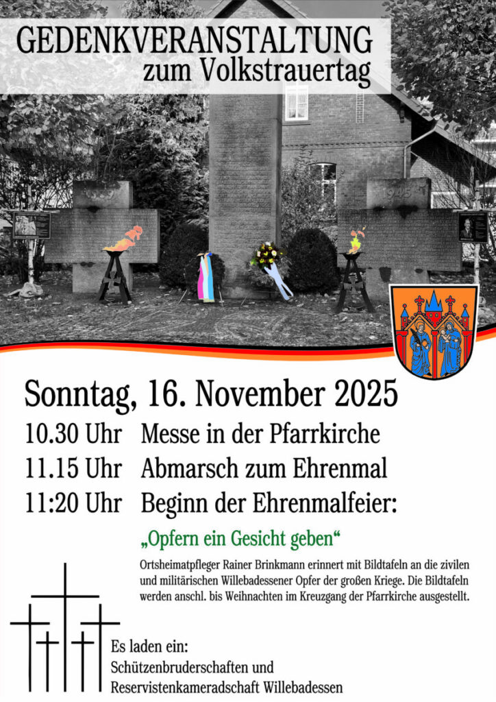 an alle Willebadessener Bürgerinnen und Bürger zur Teilnahme an der Gedenkveranstaltung am Volkstrauertag. Wie in den Jahren wird in der Veranstaltung am Volkstrauertag der Opfer von Krieg, Vertreibung und Gewaltherrschaft aller Nationen gedacht und steht wieder unter dem Motto „Opfern ein Gesicht“ geben.