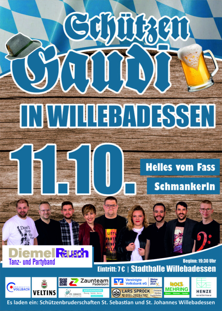 Dritte Auflage der Schützengaudi der hiesigen Bruderschaften in der Stadthalle Willebadessen. Sei dabei, wenn es wieder heißt: „O’zapft is!“ Die Top-Band „Diemelrausch“ bringt wieder den Saal zum Kochen.
